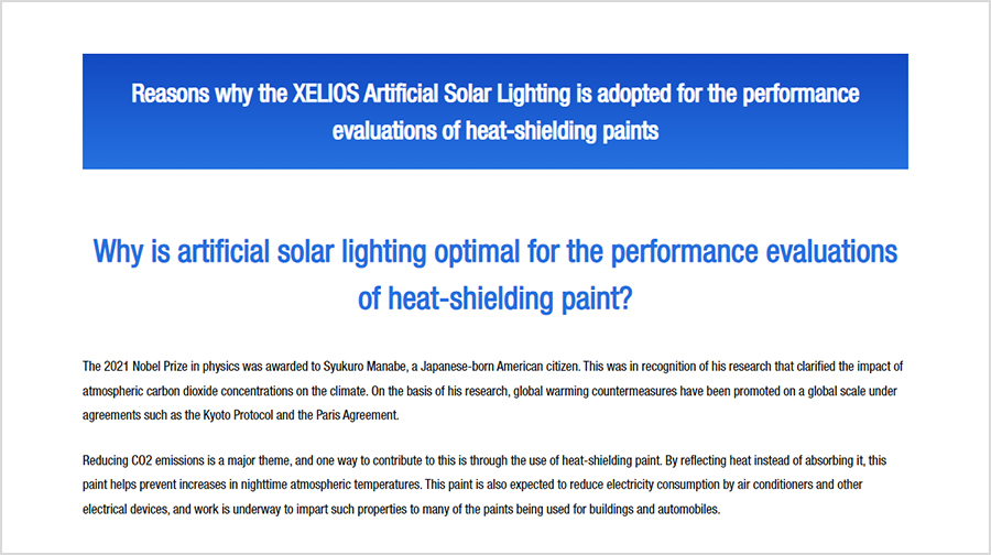 “Reasons why the XELIOS Artificial Solar Lighting is adopted for the performance evaluations of heat-shielding paints” was added to the track record of adoption by use.